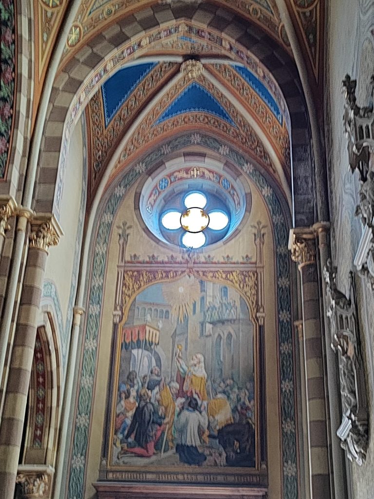 Caminamos por la vía principal y finalmente entramos en la Capilla con la imagen de la Virgen de las Gracias, a quien los fieles recurren para acercar pedidos especiales, y cuyos testimonios pueden leerse en algunos documentos expuestos allí. Luego ingresamos a la Basílica Nuestra Señora del Popolo. Imponente fachada en ladrillo a la vista con doble línea de columnas. El interior tiene valiosas obras de arte religioso y está en proceso de restauración.